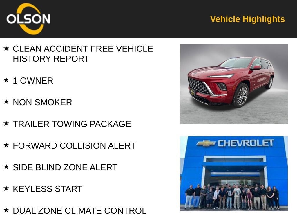 Olson Chevrolet is delighted to offer this 2025 Buick Enclave Avenir in Cherry Red Tintcoat with an Ebony Seats With Sky Gray Ebony Interior Leather interior. This Enclave is powered by a Gasoline 2.5 liter 4 cylinder engine with FWD and Automatic transmission.